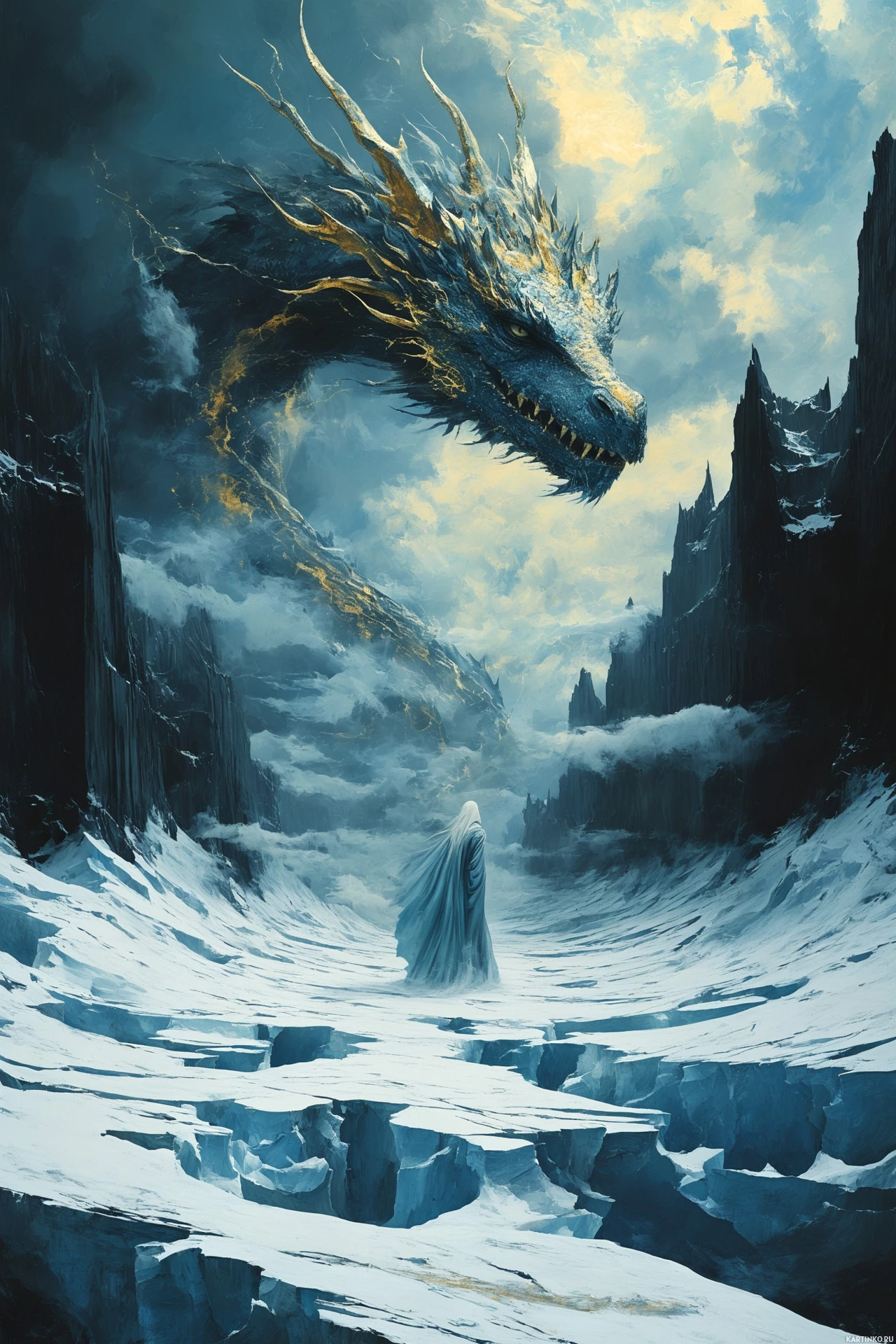 A person stands to the left of a large dragon that emerges from a cave in a snowy landscape, with mountains and an aurora sky in the background.
