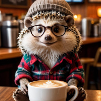 The image features an animal sitting at a table. This animal has glasses on its face, and it is holding a cup that appears to contain coffee.