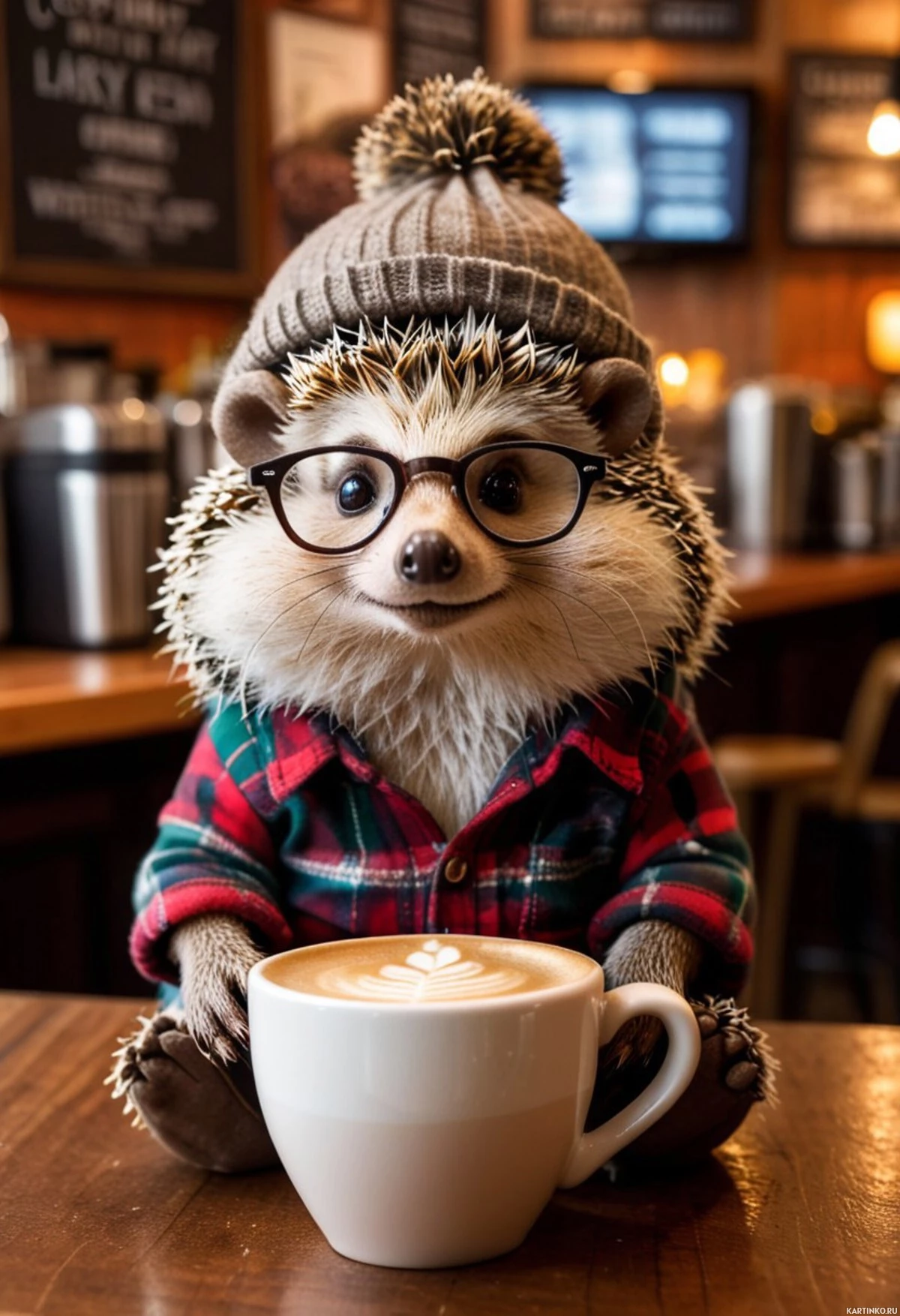 На картинке животное сидит за столом. На нём очки, и он держит чашку, в которой, кажется, кофе.
