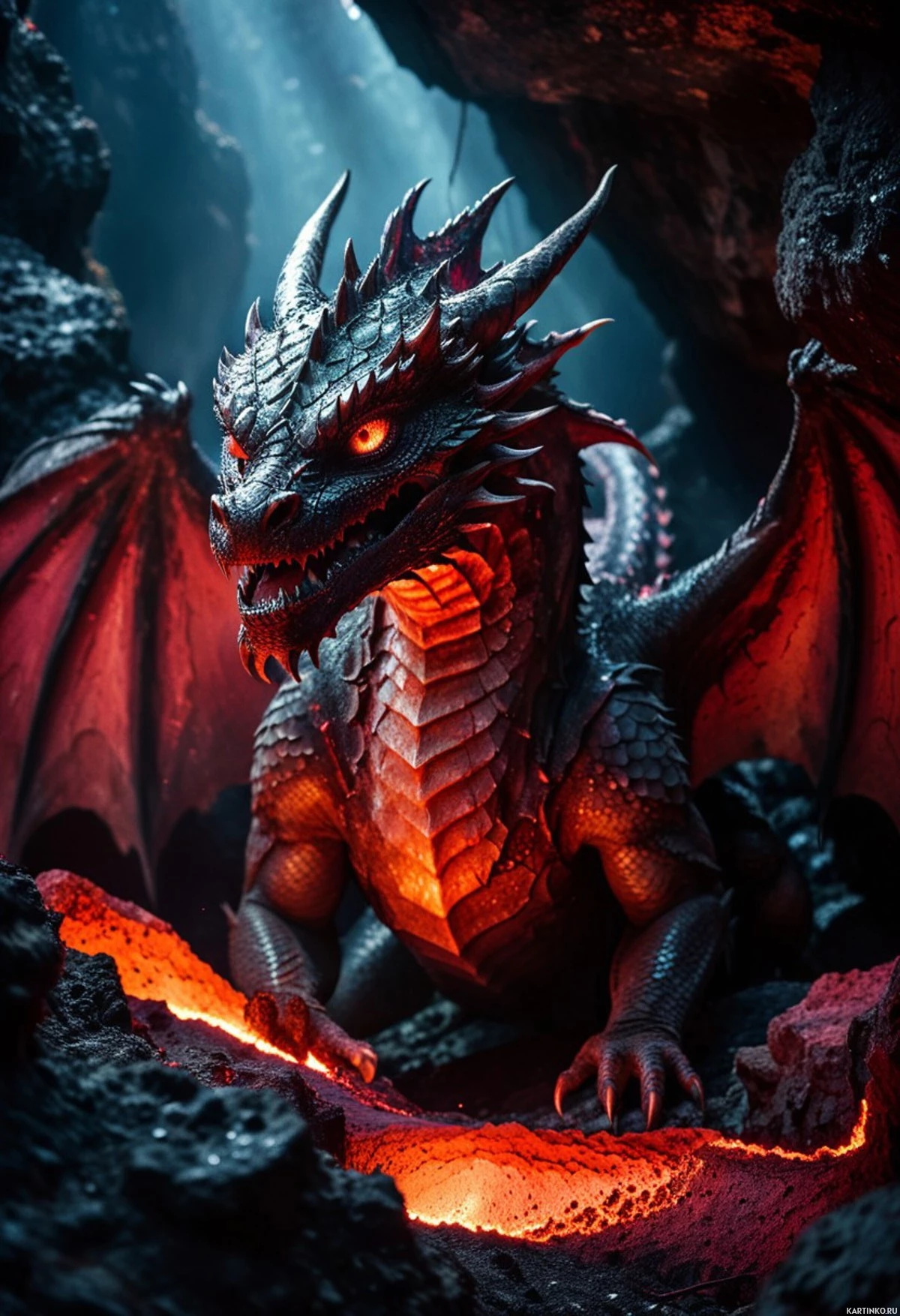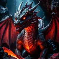 На картинке изображено фантастическое существо, похожее на дракона, в тёмном гроте. У дракона острые зубы и свирепый взгляд. Его чешуя выглядит прочной, с красными прожилками, будто бы намекающими на огонь или жар. Крылья дракона широко распахнуты, с детально проработанным оперением, создающим ощущение силы и ловкости. Существо восседает на скальных выступах, освещенных красноватым светом, возможно, от лавы или интенсивных световых эффектов. На заднем плане видны элементы этого фантастического мира: сталактиты и сталагмиты, характерные для подземных пещер, усиливающие мистическую атмосферу сцены.