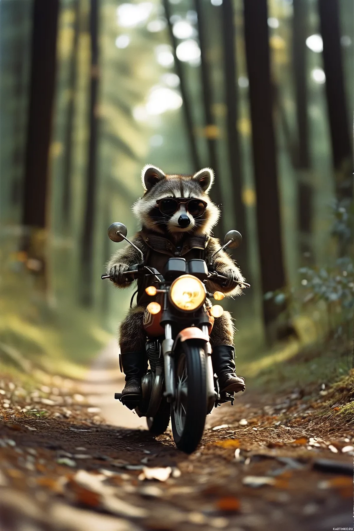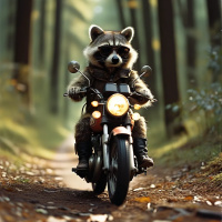 In the image, there is a raccoon wearing a brown jacket and a pair of goggles, riding on a motorcycle. The motorcycle has a headlight that is illuminated. The backdrop features a forest setting with trees lining both sides of the path the raccoon is traveling down. The raccoon appears to be in motion on the motorcycle, which suggests an action-oriented theme for the image.