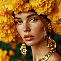 A person wearing a crown of flowers, with gold accessories around the neck and ears. The individual has a neutral expression on their face and their hair is styled down. The background features blurred elements suggesting an outdoor garden or natural setting, which might explain the flower crown.