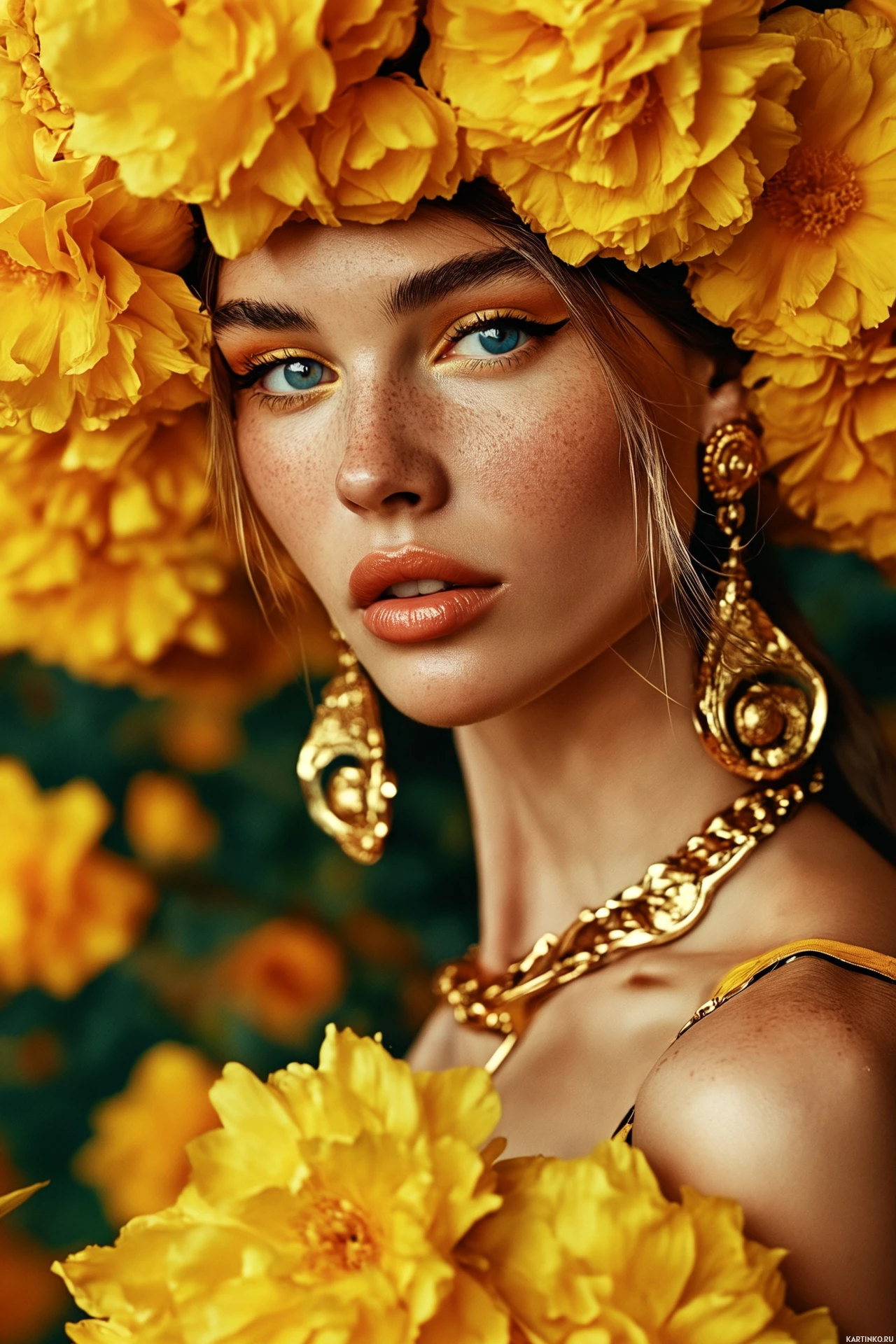 Человек в венке из цветов, с золотыми украшениями на шее и в ушах. На лице – спокойное выражение, волосы распущены. На заднем плане размытые детали, создающие ощущение сада или природного пейзажа, что вполне объясняет цветочный венок.