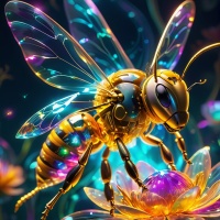 A bee with robotic wings and antennae, perched on a pink flower bud with radiating energy lines emanating from its head, all set against a backdrop of purple stars.