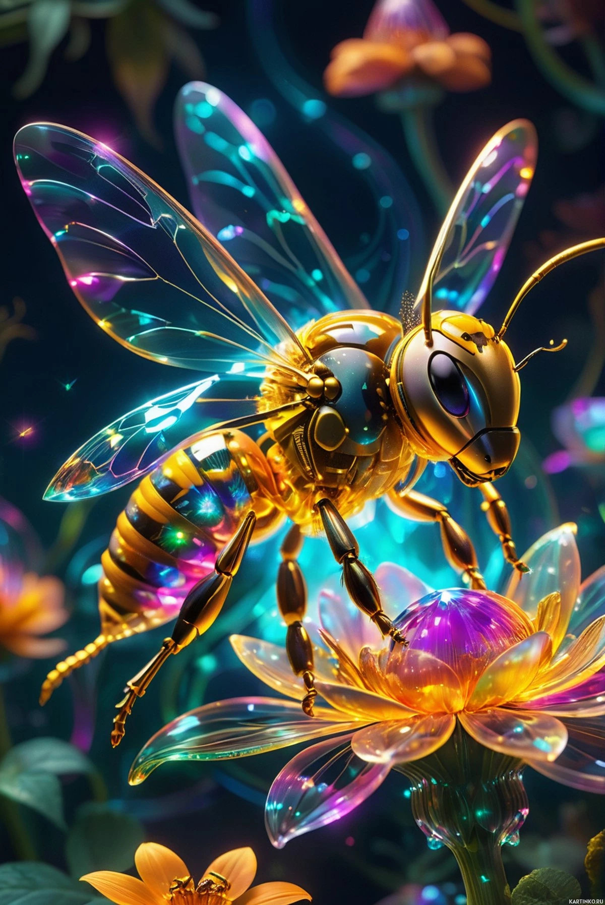 Пчела с роботизированными крыльями и антеннами, сидящая на розовом бутоне цветка, от которого расходятся линии энергии, на фоне пурпурных звезд.