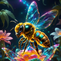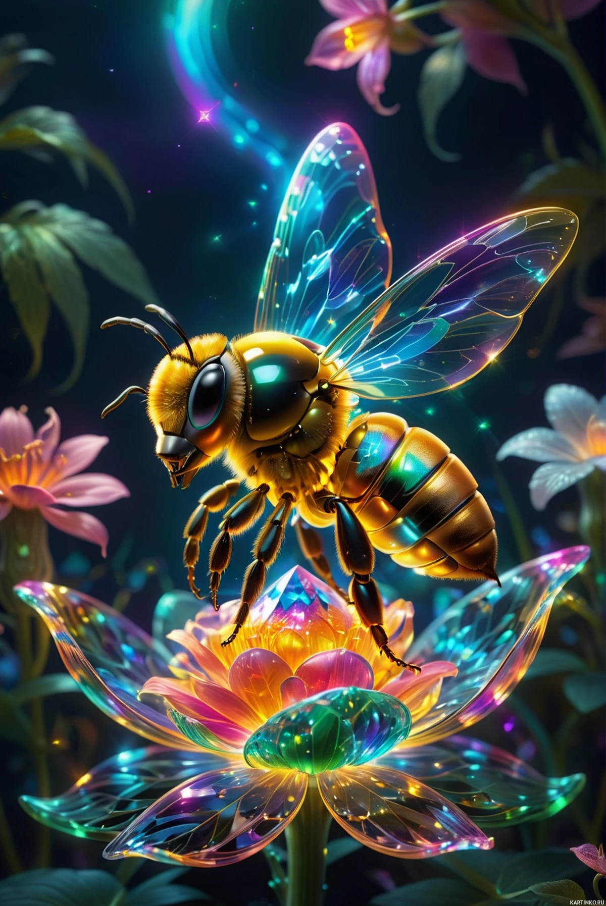 The image features a vibrant digital illustration of a bee perched on top of a lotus flower with petals that resemble colorful crystals. Surrounding the central motif are various elements: blue and purple flowers, possibly orchids or lilies due to their delicate appearance; a few stars or light sources in the background that add depth to the scene; and an ethereal blue smoke emanating from the bee's body. The colors used are predominantly vivid with a palette that includes blues, purples, greens, and hints of gold. The style is highly stylized with smooth lines and dramatic lighting effects to create a dreamlike quality.