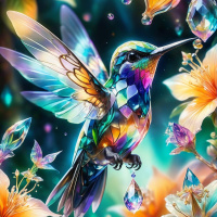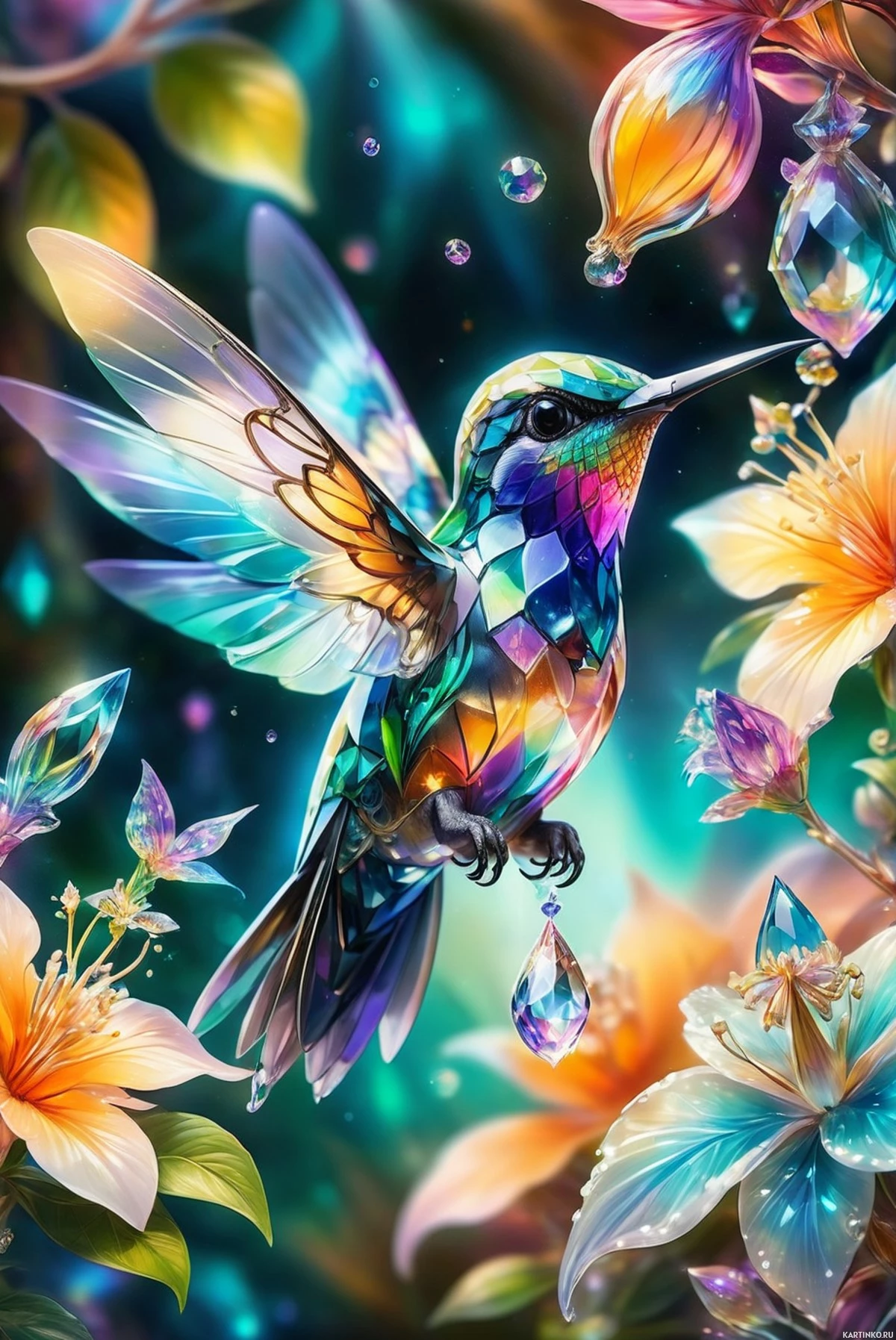 Картинка показывает ярко окрашенного колибри, сидящего на камне. У птицы переливчатые перья оттенков синего, зеленого и оранжевого с замысловатыми узорами, которые кажутся отражающими свет или мерцающими. Крылья полностью расправлены, а хвост развернут веером. На заднем плане – небесные элементы, такие как звезды и планеты на фоне темного неба, что создает ощущение потусторонности или мистицизма. На переднем плане также находятся фантастические цветы с лепестками, которые, кажется, светятся собственным светом, добавляя волшебную атмосферу в сцену. Художественный стиль яркий, с использованием контрастных цветов и детализированных текстур для создания ощущения глубины и реалистичности, несмотря на присутствующие элементы фэнтези. Общее впечатление – очарование и неземная красота.