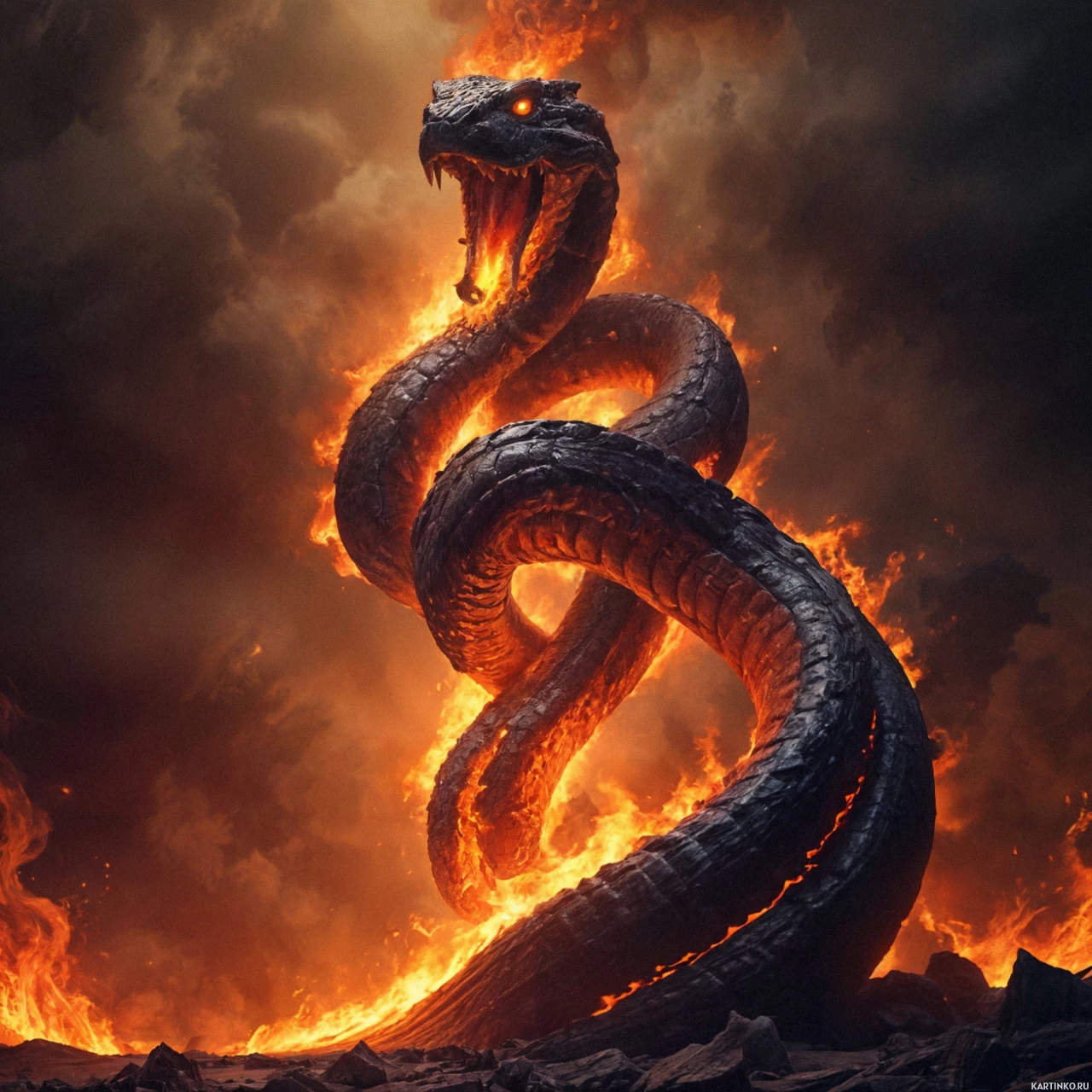 Картинка с фантастическим сюжетом, изображающая змею, словно сотканную из расплавленной лавы или магмы, окружённую языками пламени и клубами дыма. Змей обвивает, кажется, источник тепла или силы. Фон занят мрачными, грозовыми облаками, а эффектная подсветка подчеркивает напряжённость происходящего.