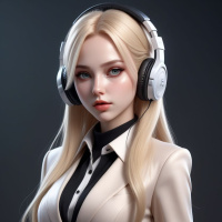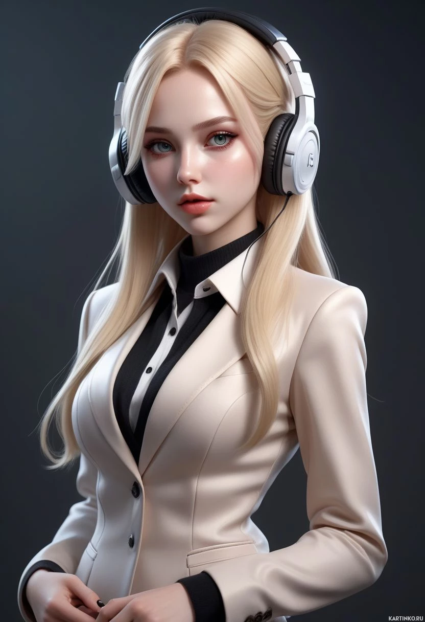 audio entertainment. The style of the image leans toward realism but includes artistic elements such as the stylization of her features and the overall design quality, which is typical for digital illustrations or 3D models designed to look like a real person with exaggerated beauty standards. The character's attire consists of a light-colored blouse paired with what appears to be a darker blazer or jacket, giving her outfit a formal yet stylish appearance. The overall composition is balanced, and the colors are soft, which gives the image a calm and modern feel.