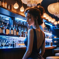 На картинке изображена фигура, сидящая в баре. Спиной к камере, на ней платье с глубоким вырезом и обтекаемым дизайном, которое может быть выполнено из блестящей ткани, возможно, латекса или спандекса. Волосы уложены таким образом, что обрамляют верхнюю часть головы и шею. На барной стойке перед ней несколько бутылок, вероятно, с алкогольными напитками, учитывая обстановку. Окружающее пространство окутано приглушенным светом, создающим интимную или изысканную атмосферу.