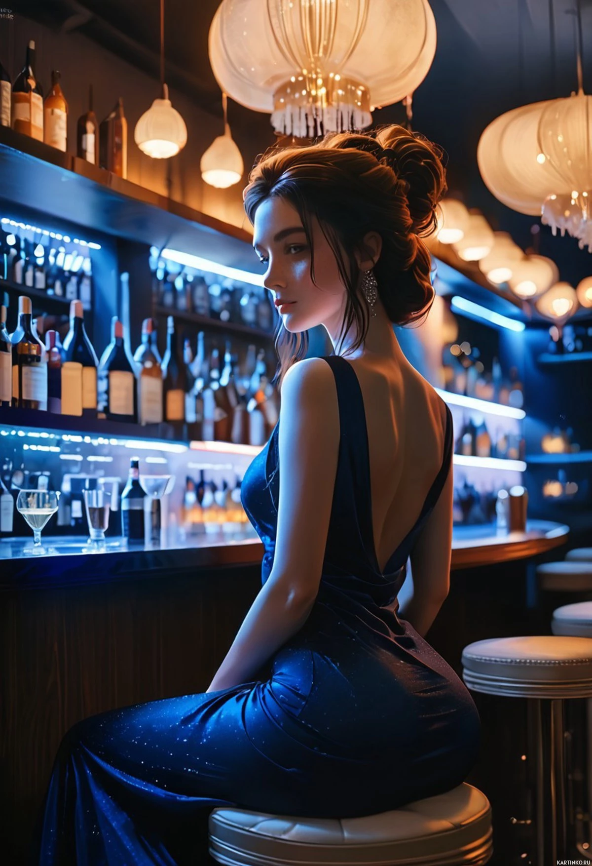 Девушка в голубом платье сидит за барной стойкой Картинки с такими же тегами