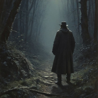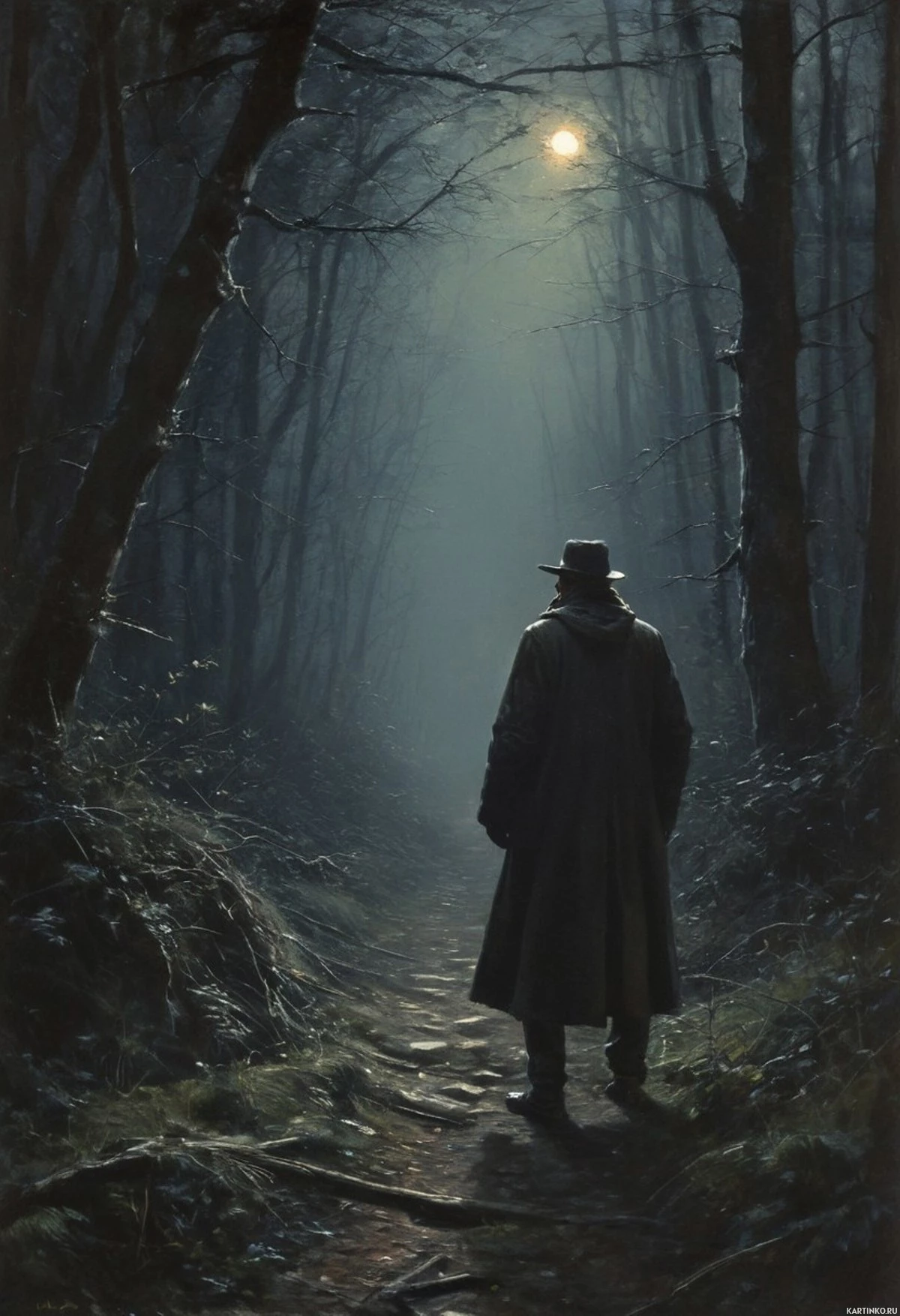 На картинке – силуэт мужчины, удаляющегося по узкой тропинке в густом ночном лесу. На нём плащ и шляпа, что намекает на прохладную или дождливую погоду. Вокруг – деревья с голыми ветвями и туман, создающие жутковатую атмосферу. Над ним ярко светит луна, освещая его фигуру. Под ногами – неровная, каменистая почва.