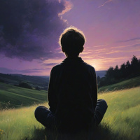 In the image, a person is seated on the grass with their back turned to the viewer. They are depicted in silhouette against a dramatic sky. The individual is wearing a dark top and pants, suggesting they might be engaged in meditation or simply enjoying the tranquil setting at sunset. In front of them, there are several purple flowers that add a touch of color to the scene. The backdrop features an open field with scattered trees under a cloudy sky. The horizon is marked by the colors of the sun setting behind clouds, which casts a soft glow across the landscape. The overall atmosphere is peaceful and serene, fitting for what could be described as a children's silhouette due to its whimsical subject matter.