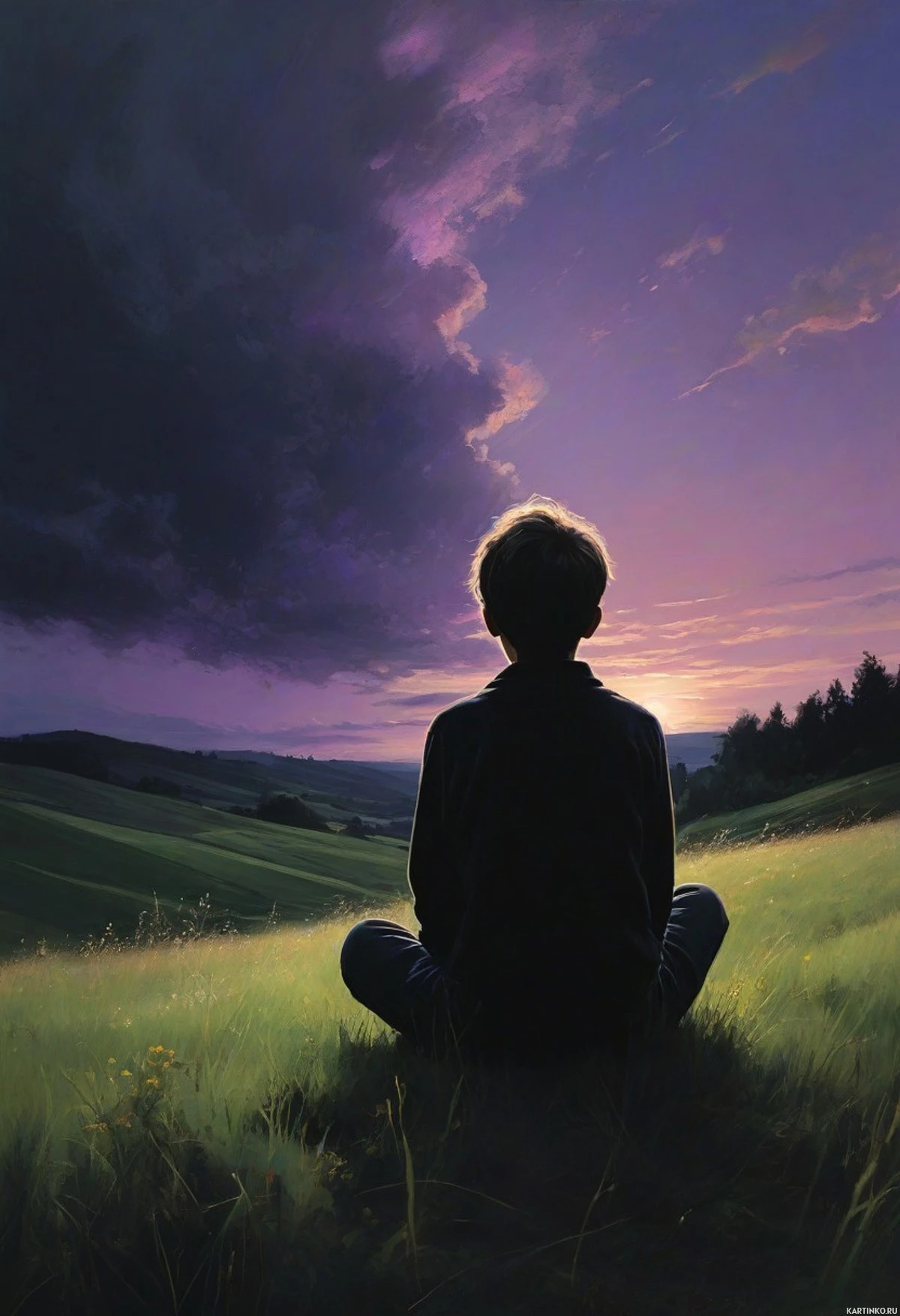 На картинке человек сидит на траве спиной к зрителю. Он выделен силуэтом на фоне впечатляющего неба. На нём тёмная одежда, что может говорить о медитации или просто о наслаждении спокойной обстановкой на закате. Перед ним несколько фиолетовых цветов, добавляющих красок в эту сцену. На заднем плане – открытое поле с разбросанными деревьями под облачным небом. Линия горизонта отмечена цветами заката, скрытого за облаками, которые отбрасывают мягкое свечение на пейзаж. В целом, атмосфера спокойная и умиротворенная, подходящая для детского силуэта благодаря своей сказочной тематике.