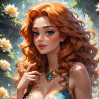 red hair, dressed in an elegant and fantasy-inspired attire. She is wearing