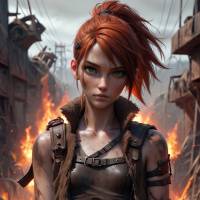 The image features a character with red hair styled in braids, donning attire that suggests a historical or fantasy setting. She has a stern facial expression and her arms are crossed in front of her body. There are visible elements of fire and destruction around her, indicating conflict or chaos.