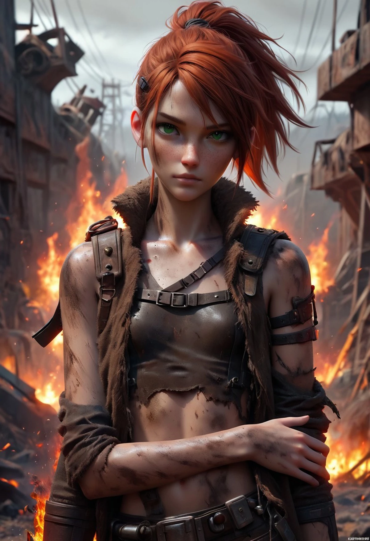 скрещенные руки | Crossed arms | Смелая девушка с рыжими волосами стоит перед огнём
