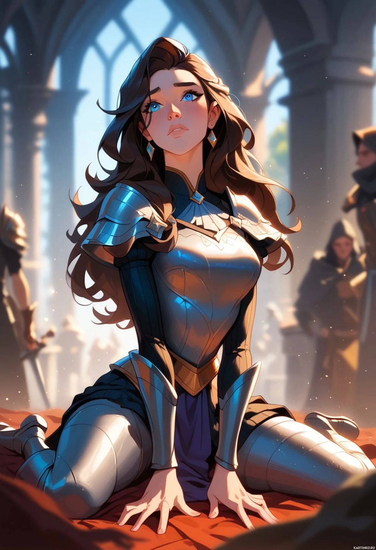 На картинке изображена девушка с длинными каштановыми волосами в средневековых доспехах и шлеме. Она сидит на земле, глядя вверх с задумчивым или сосредоточенным выражением лица. На ней серебряные пластинчатые доспехи и фиолетовый плащ, наброшенный на плечи. На заднем плане видны другие фигуры, предположительно часть группы, возможно, воины или солдаты, но они не так выделяются, как главная героиня. Место действия указывает на исторический или фэнтезийный сеттинг, вероятно, относящийся к видеоигре или кинопостановке о средневековье.