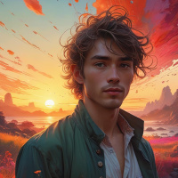 a dark jacket with a lighter, possibly white or cream-colored shirt underneath. The background features dramatic sky elements, such as clouds that are illuminated from behind, suggesting the sun might be rising or setting. There are also subtle hints of flora and fauna, including what appears to be a flower on the left side and possibly