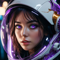 The image features a young woman with brunette hair wearing an astronaut helmet and suit. She has purple eyes, giving her a distinctively otherworldly appearance. Her expression is serious and contemplative. There are subtle hints of wear on the suit, indicating that she might be in space or preparing for a mission. The background is dark and ominous, suggesting a science fiction setting.