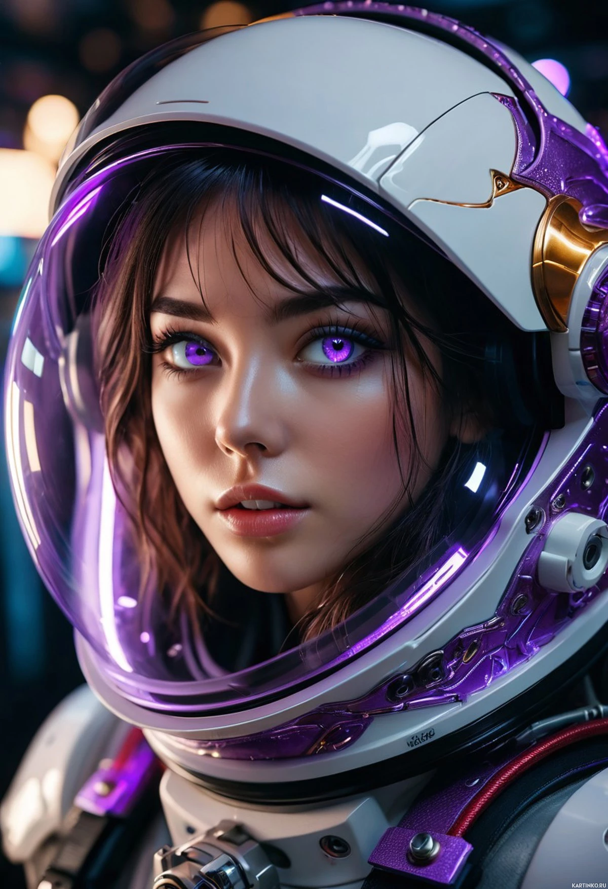 На картинке изображена молодая женщина с каштановыми волосами в скафандре и шлеме. У нее фиолетовые глаза, придающие ей необычный, внеземной вид. Выражение лица серьезное и задумчивое. На скафандре заметны легкие следы износа, намекающие на то, что она может быть в космосе или готовиться к миссии. Фон темный и зловещий, что указывает на научно-фантастический сеттинг.