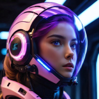 The image features a person wearing futuristic armor with a pinkish-purple color scheme and a helmet that has a visor which is partially down, revealing the face. The armor includes what appears to be tech details such as lights, panels, and possibly life support indicators or communication devices. The individual's hair is styled in a way that suggests it could be long and falls over the shoulders, with a hint of purple coloration which matches their helmet. The background is indistinct but seems to be an industrial or sci-fi setting with cool lighting effects highlighting the armor.
