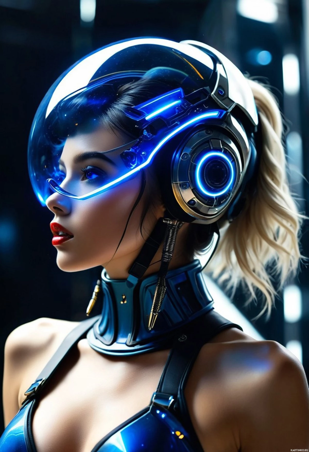 На картинке изображена женщина в сложном, футуристичном шлеме и головном уборе, который выглядит как часть костюма из научно-фантастического фильма. Шлем оснащен забралами, возможно, для улучшения зрения или защиты. У неё короткие светлые волосы и нейтральное выражение лица. Фон приглушённый, в сине-черных тонах, что намекает на высокотехнологичную обстановку.