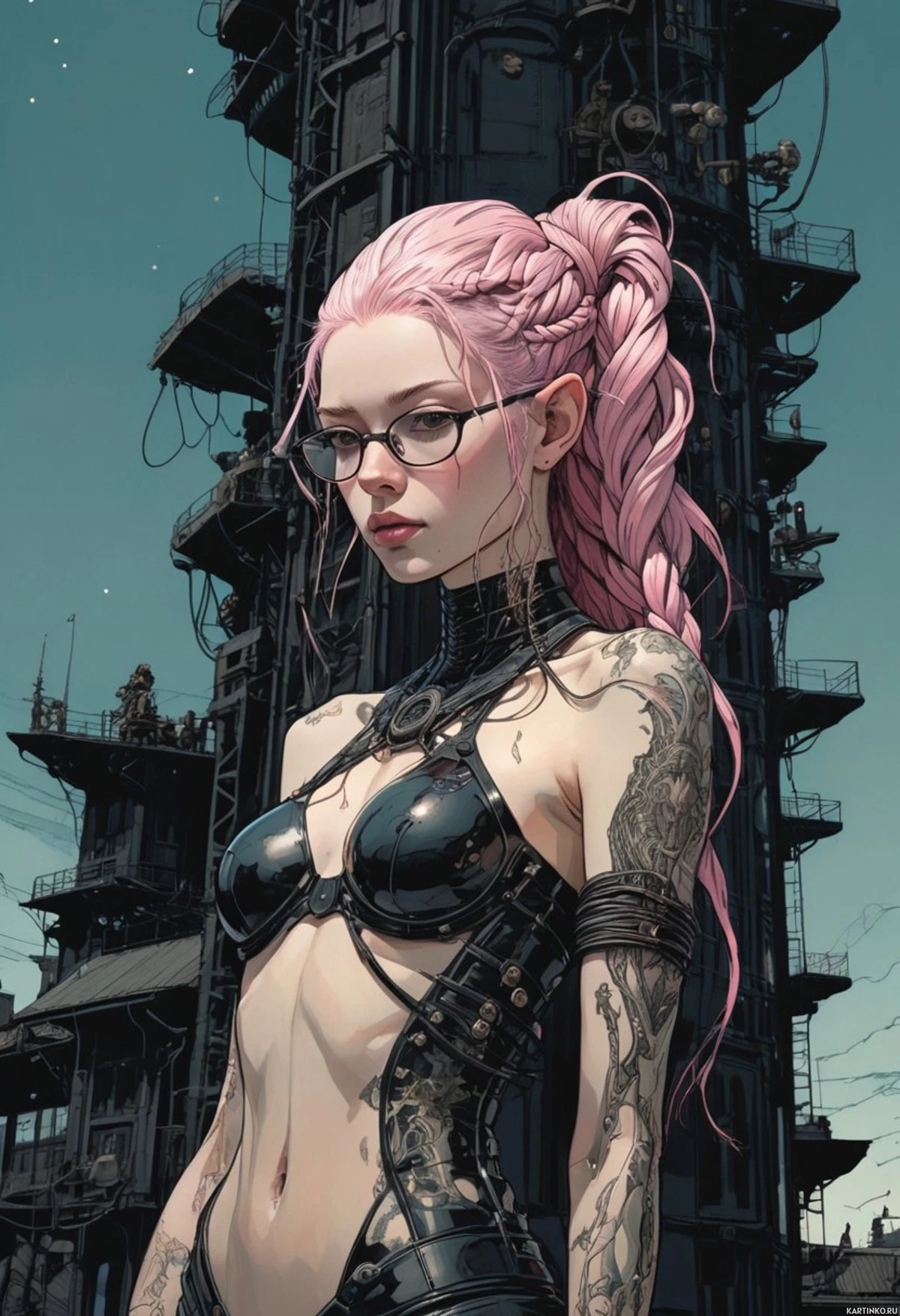 На картинке изображена женщина с розовыми волосами, уложенными на челку. На ней очки, а на руках и шее видны татуировки. Она одета в топ, напоминающий корсет, чёрный пояс и чёрные перчатки с металлическими деталями, похожими на доспехи. На заднем плане – индустриальный пейзаж с высокими конструкциями, напоминающими трубы или цилиндрические объекты. Освещение говорит о том, что это день.