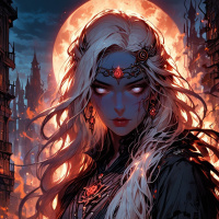На картинке персонаж с белыми волосами и неземной внешностью стоит на фоне городского пейзажа, залитого лунным светом. На ней сложный доспех с узорами, вдохновленными фэнтези или мифологией. Доспех украшен замысловатыми узорами и драгоценностями, придавая ему изысканный вид. В одной руке она держит посох, украшенный символами, которые можно интерпретировать как магические. Общая цветовая гамма картинки выдержана в темных тонах, контрастирующих со светлой кожей персонажа и ярким лунным сиянием, освещающим сцену.