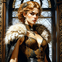 На картинке изображена женщина в костюме в стиле фэнтези. У неё светлые волосы, а на ней, похоже, доспехи с меховой отделкой, что может говорить о вдохновении скандинавской или викинговской эстетикой. В её наряде сочетаются корсеты и кожа, видны металлические шипы и вышивка, создавая впечатление доспехов воительницы. На заднем плане – архитектурный фон, напоминающий витражное окно в готической или средневековой обстановке. Фигура стоит, положив руки на бедра, и выглядит уверенно.