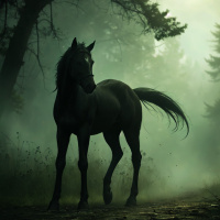 На картинке запечатлён одинокий конь в туманном лесу. У коня – характерная чёрная грива и хвост, он застыл в движении, словно скачет по грунтовой тропинке. Вокруг – буйная, зелёная растительность, на заднем плане видны хвойные деревья. Атмосфера картинки одновременно спокойная и таинственная, благодаря приглушённому свету и туману, окутывающему пейзаж.
