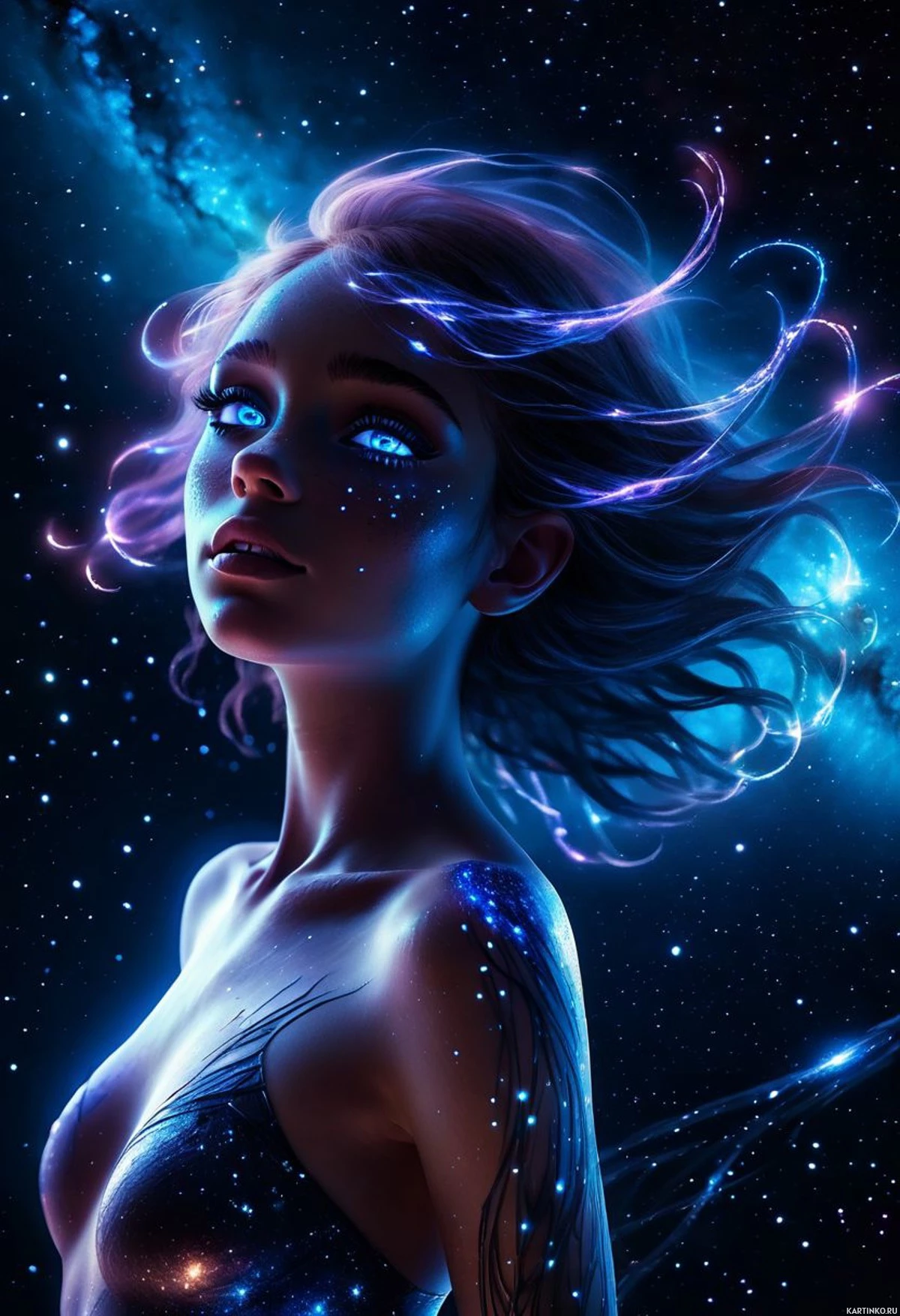 a thoughtful expression as she gazes into the distance. The background features stars and cosmic elements, suggesting a space or fantasy theme. Her attire includes a blue bodysuit with