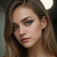 На картинке молодая женщина смотрит прямо в камеру, слегка повернув голову, что позволяет увидеть ее профиль в трехчетвертном ракурсе. У нее светлая кожа, легкий макияж, подчеркивающий глаза и губы. Волосы до плеч, выпрямленные. Освещение выделяет черты лица, создавая теплое сияние, намекающее на мягкое, внутреннее освещение. Фон размыт, но кажется, что это интерьер, возможно, комната с искусственным освещением.