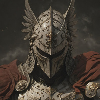 На картинке изображен персонаж в доспехах, преимущественно серебряных, с золотыми акцентами, особенно на нагруднике и наплечниках. Шлем имеет два выступающие вверх рога, придающие ему агрессивный вид. На нем также красные одежды, похожие на плащ или робу, которые резко контрастируют с металлическим доспехом. Фон темный, с драматическим освещением, которое подсвечивает персонажа снизу, создавая ощущение власти и силы. Это создает сильный визуальный эффект, подчеркивающий присутствие и мощь закованного в доспехи воина. Освещение и тени создают мрачную атмосферу на картинке.