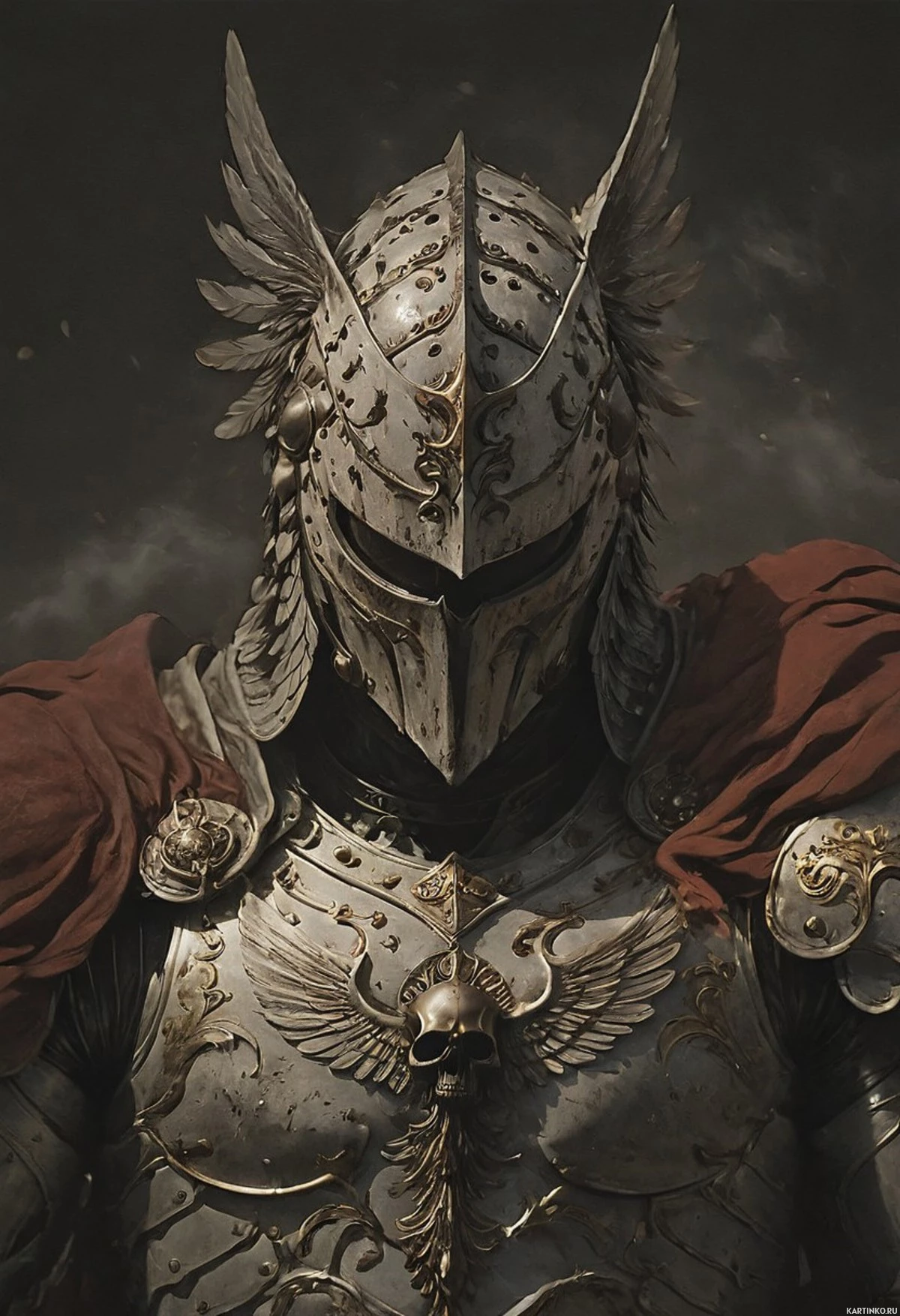 The image features a figure wearing armor that is predominantly silver with gold accents, particularly on the chest and shoulder guards. The helmet has two points extending upwards from it, giving it an aggressive appearance. The figure also dons red attire, suggesting a cloak or robe, which adds a stark contrast to the metallic armor. The background is dark with dramatic lighting that illuminates the figure from below, creating a sense of dominance and power. This creates a strong visual effect, emphasizing the armored warrior's presence and strength. The lighting and shadow effects contribute to a moody atmosphere in the image.
