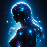 starry skies, which complements the celestial theme of her appearance. The art style leans towards realism with a hint of surrealism, particularly in the glowing effect around her shoulder and the stylized hair. The overall mood of the image is serene and mystical, evoking