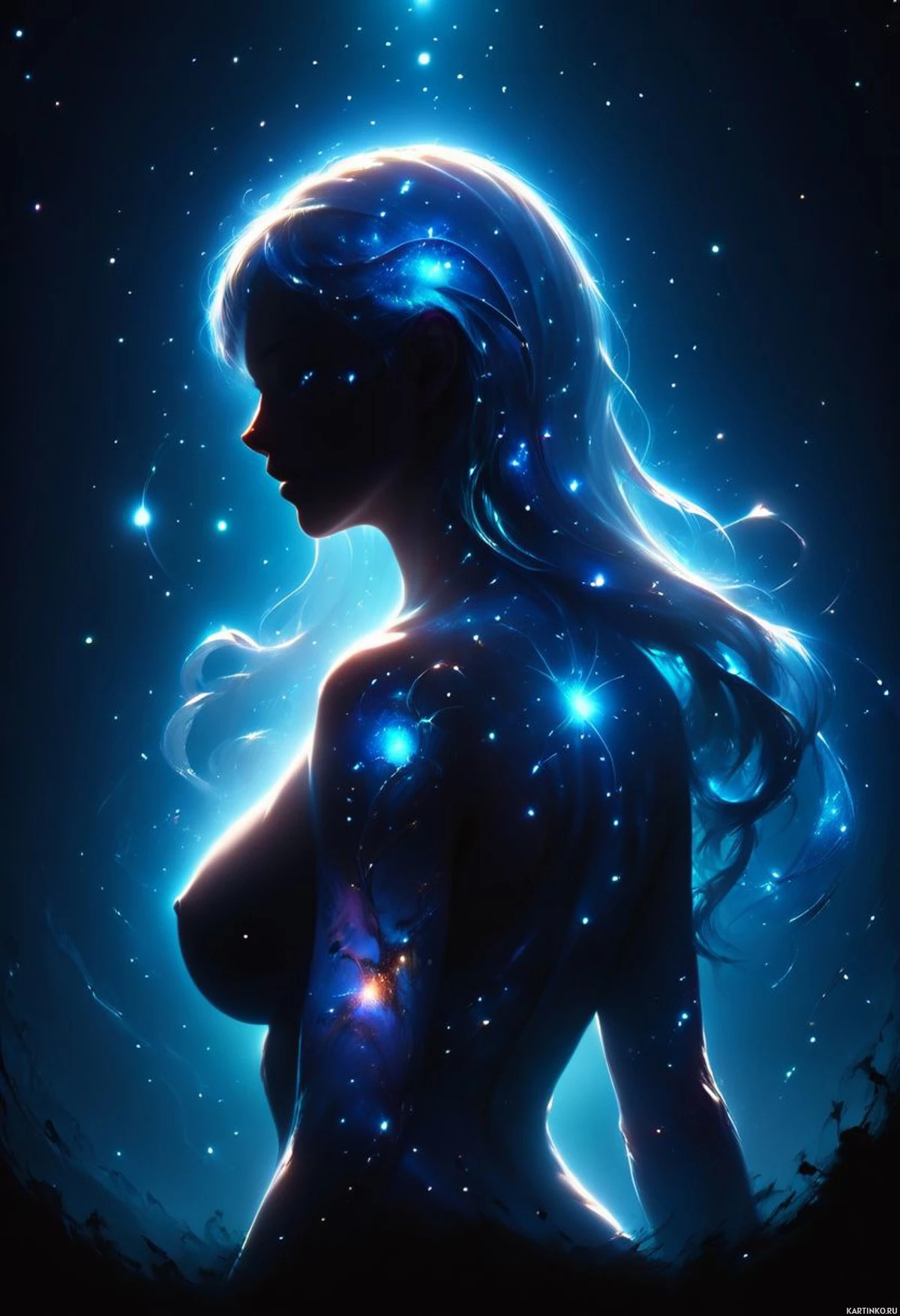 a glowing effect around her right shoulder area, suggesting an otherworldly or ethereal quality to the image. The background is a cosmic scene with