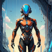 В центре бескрайнего арктического пейзажа уверенно движется фигура в футуристических доспехах. Яркое сочетание оранжевого и черного выделяет костюм на фоне ледяной синевы. На голове – шлем, скрывающий лицо и предоставляя простор для воображения. Доспехи детализированы: панели и сочленения намекают на движение и функциональность. Фигура излучает целеустремленность, каждый шаг отзывается мерным ритмом марша по этому сюрреалистичному ландшафту. По обе стороны возвышаются гигантские ледяные образования, чьи ледяные поверхности отражают свет сверху. Вдали пещера, освещенная синим свечением, служит маяком в этой замерзшей глуши. Картина словно сошла с полотна научно-фантастического мира, гармонично сочетая элементы фантастики и потрясающий визуальный ландшафт.