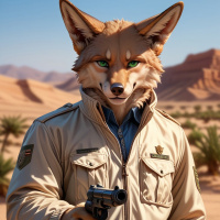 На картинке изображён антропоморфный персонаж с чертами лисы, стоящий в пустынной местности. У него характерный окрас шерсти, напоминающий рыжий. Он одет в бежевую военную куртку, украшенную нашивками и значками, под ней – голубая рубашка. В правой руке он держит пистолет. На заднем плане – песчаный ландшафт с редкой растительностью и скальными образованиями, типичными для пустыни.