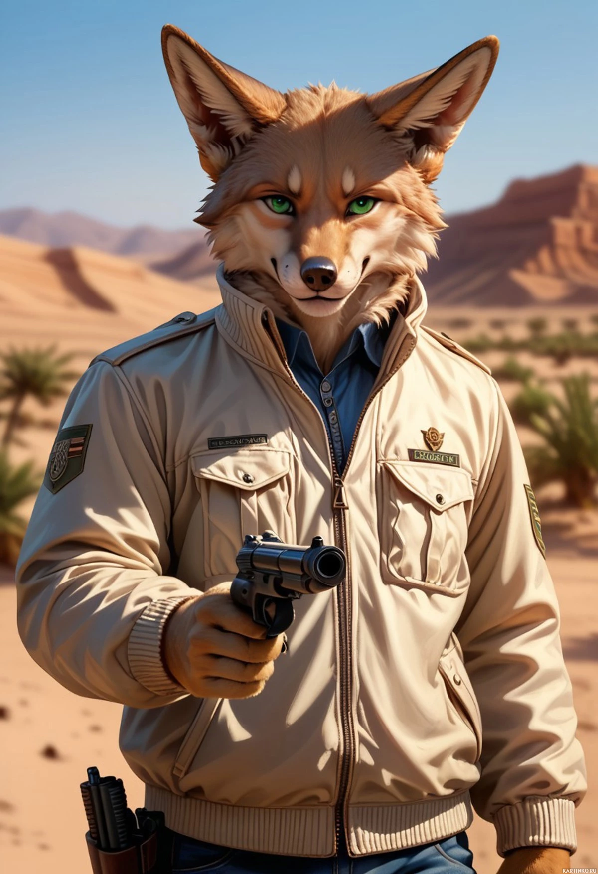 The image portrays an anthropomorphic animal with fox-like features standing in a desert setting. It has distinctive fur patterns, resembling those of a red fox. The character is dressed in a beige military jacket adorned with patches and badges, along with a blue shirt underneath. In its right hand, it holds a pistol. The background reveals a sandy landscape punctuated by sparse vegetation and towering rock formations characteristic of desert environments.