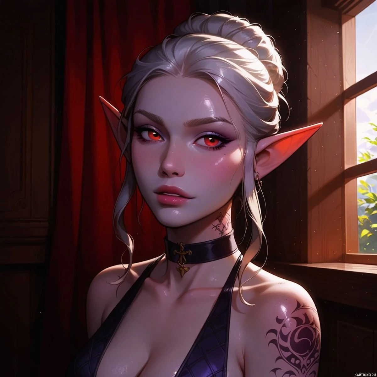 На картинке изображён персонаж с белыми волосами, собранными в высокую причёску, с несколькими прядями на лбу. У него заострённые уши и, кажется, красные глаза, что указывает на то, что он, скорее всего, эльф или сказочное существо. У персонажа светлая кожа и тёмная помада. На нём топ с шнуровкой и лямками на плечах, под которыми видна татуировка на плече. Также на шее – фиолетовый аксессуар из ткани. Задний план – интерьер с деревянными стенами, возможно, комната, и окно слева, через которое проникает естественный свет.