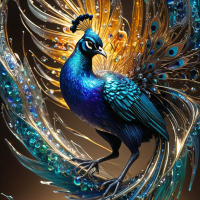 The image features a peacock with its wings fully spread, exhibiting the vibrant colors of blue, green, and gold. The bird is perched on a circular platform that has a pattern resembling feathers or snowflakes, colored in shades of white and blue. Surrounding the bird are whimsical elements such as a small flame-like shape with orange hues and sparkles of light, creating an ethereal effect around the peacock. The background is dark, possibly suggesting a night setting or a deep space, which contrasts with the bright colors of the peacock and enhances its vibrancy.