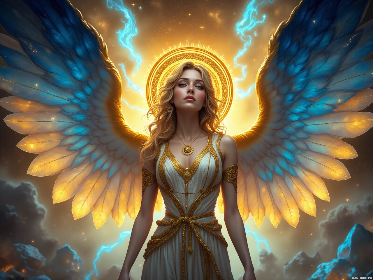 blonde hair, which is common for angelic representations in various art forms and media. The character is wearing what seems to be an armor or outfit with a celestial motif, including