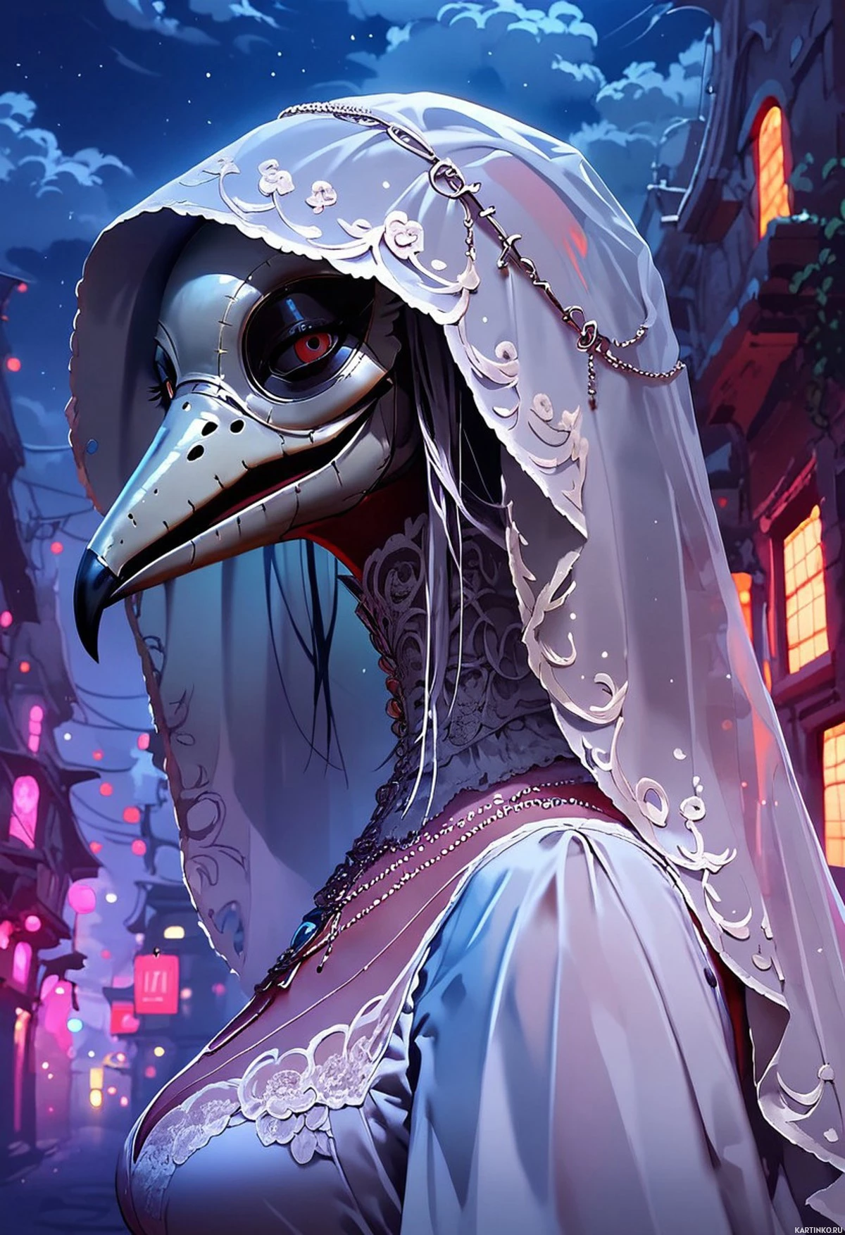 На картинке изображено фантастическое антропоморфное существо с голубой кожей и белыми волосами, стоящее в ночном переулке. У персонажа большие выразительные глаза и заметный клюв, придающие ему сходство с птицей. На нём белое одеяние, украшенное золотыми элементами, а на руках видны перья. На заднем плане – традиционная восточноазиатская архитектура, фонари освещают переулок, создавая атмосферу волшебства.
