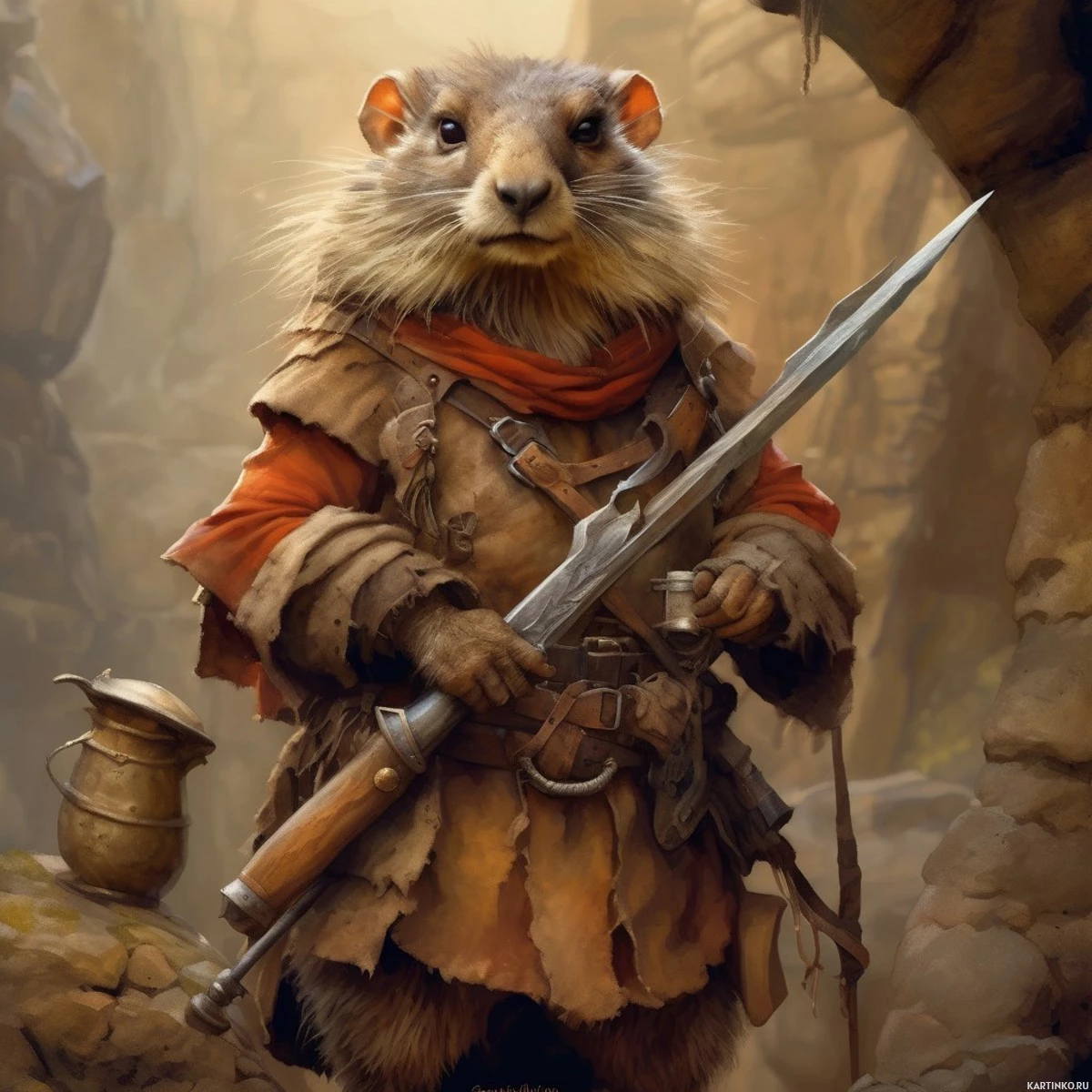 На картинке изображён антропоморфный зверек, похожий на сурка, облачённый в средневековые доспехи и держащий меч в ножнах. Он стоит перед каменной аркой или воротами, что указывает на фантастический сеттинг. На персонаже – шлем, нагрудник и другие элементы доспехов, выполненные с вниманием к деталям и вдохновлённые историческими средневековыми стилями.