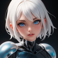 The image features a 3D character of a female with short white hair and blue eyes. She has a stylized appearance, with exaggerated facial features such as large eyes and a small mouth. The character is wearing intricate armor that includes metallic parts with a blend of gold and silver tones, and there are visible designs or engravings on the armor's surfaces.