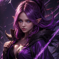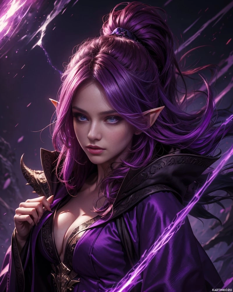 The image features a fantasy-themed character with purple hair and striking blue eyes. She appears to be an elf, judging by her pointed ears and the presence of what looks like an enchanted necklace around her neck. Her expression is serious, and she is wearing armor that is predominantly purple in color, suggesting a royal or magical status within the context of this fantasy world. Behind her, there are electrical sparks and bolts, which adds to the magical ambiance of the image. The artwork is highly detailed, indicative of digital art quality.