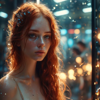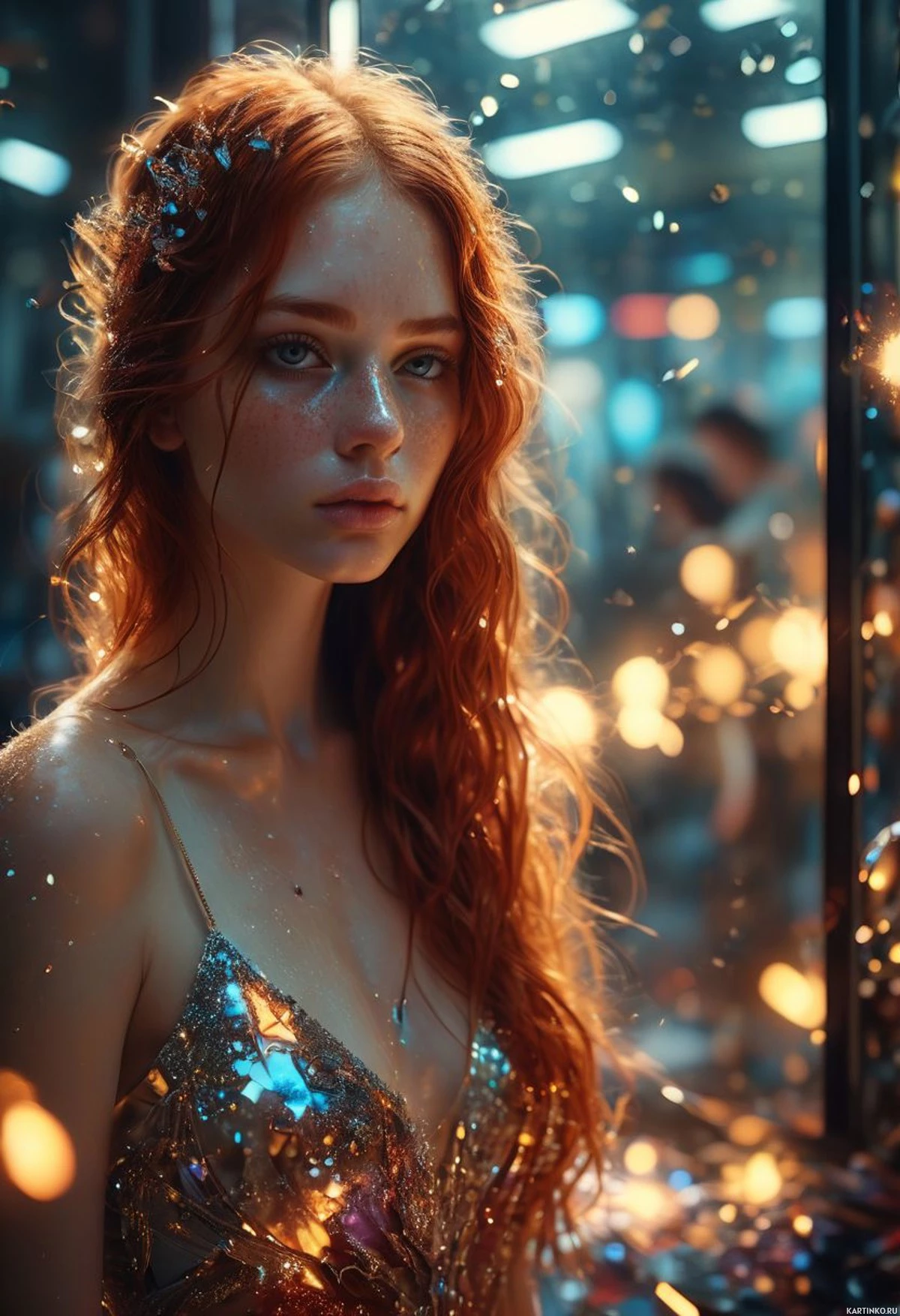 a plunging neckline and embellished sleeves that sparkle as if made of sequins or similar material. There is an accessory in her hair that adds to the overall glamorous and fantasy-inspired look. Her hair is long, and she has freckles on her face. The background appears to be dimly lit with a hint of sparkling lights, which could suggest