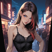 На картинке изображена женщина, стоящая на оживлённой ночной улице, выполненной в стиле, возможно, вдохновленном старинной европейской архитектурой. Она смотрит в камеру с уверенностью и прямой взгляд. На ней черная кружевной бюстгальтер с тонкими бретельками, черная кожаная куртка и облегающие черные брюки. Её волосы уложены в объемные волны, сочетающие в себе оттенок красного и темные тона, что красиво контрастирует со светлой кожей. Вокруг неё видны фонари и вывески, создающие атмосферу активной ночной жизни.