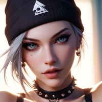 In the image, there is a young woman who has white hair. She is wearing a black beanie that features what appears to be a logo or emblem on the front. The woman also has visible piercings in her ears and nose. Her makeup includes dark eyeliner and mascara, which gives her a striking appearance. She is dressed in a black tank top with a textured design that suggests it might have a leather-like texture. Around her neck, there's a choker made of what looks like black leather or a similar material. She has multiple accessories: on her left ear, she wears an earring and a ring on her nose. Her expression is neutral with a hint of confidence in her eyes. The lighting in the image highlights her features and creates a shadow under her chin, indicating that there might be a strong source of light above her, possibly from the sun or a studio light. Please note that this description focuses on the visible content of the image and does not include any speculative elements or interpretations beyond what is directly observable.